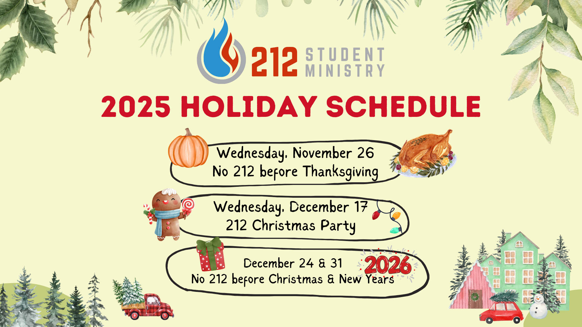212 Student Ministry meets Wednesday Nights during the school year from 6-8 PM. Students in grades 6-12 are welcome.